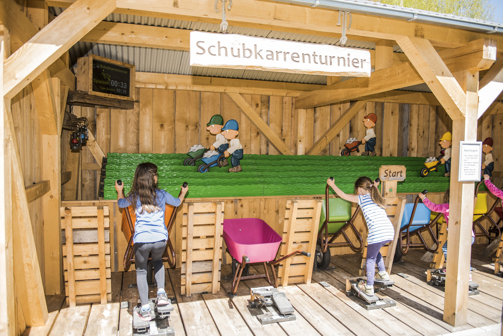 Begeistert tummeln sich die Kinder im Wasserspielgarten. Hier wird gepumpt und gestaut, umgeleitet, gefördert und geplanscht. Mit dem „Schubkarren-Turnier“ laden wir Kinder und Erwachsene zu einem lustigen Wettstreit ein.