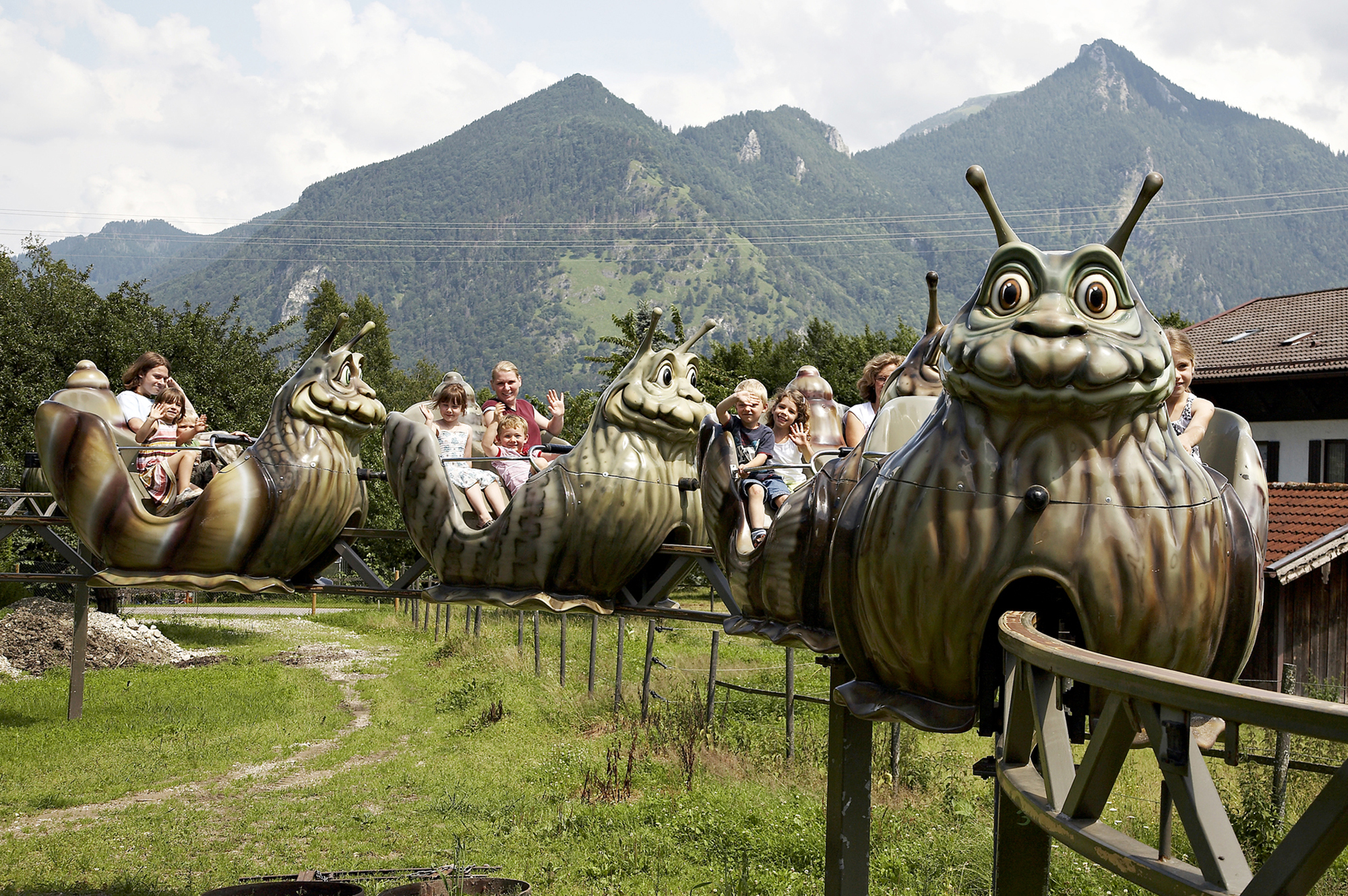 „Auf die Schnecke fertig los!“ Auf der Trethochbahn namens „Schneckenrennen“ können die Fahrgäste in flottem Schneckentempo, oder ganz gemütlich wie mit der Schneckenpost, dahingondeln und über den Köpfen der Besucher die Aussicht genießen.